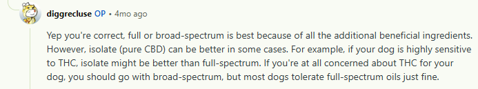 Korisnik foruma preporučuje korištenje CBD ulja punog spektra od industrijske konoplje (tj. do 0,2% THC-a) za pse. Međutim, upozorava na pretjeranu upotrebu i sporo povećanje doza kod pasa.